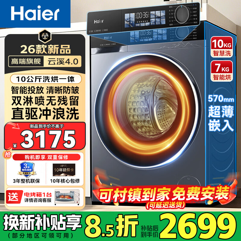 海尔(Haier)滚筒洗衣机26款新品10/11公斤云溪4.0直驱变频洗烘一体机全自动带烘干国家补贴一级能效以旧换新 10KG【直驱冲浪洗+智能投放+蓝盾除菌】 滚筒洗烘 咨询客服更优惠