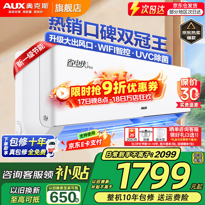 奥克斯(AUX)家电补贴20%空调 大1.5匹/1匹新一级/三级变频冷暖 节能静音除菌自清洁空调挂机 以旧换新 大1.5匹 一级能效 【wifi智控 省电45%】