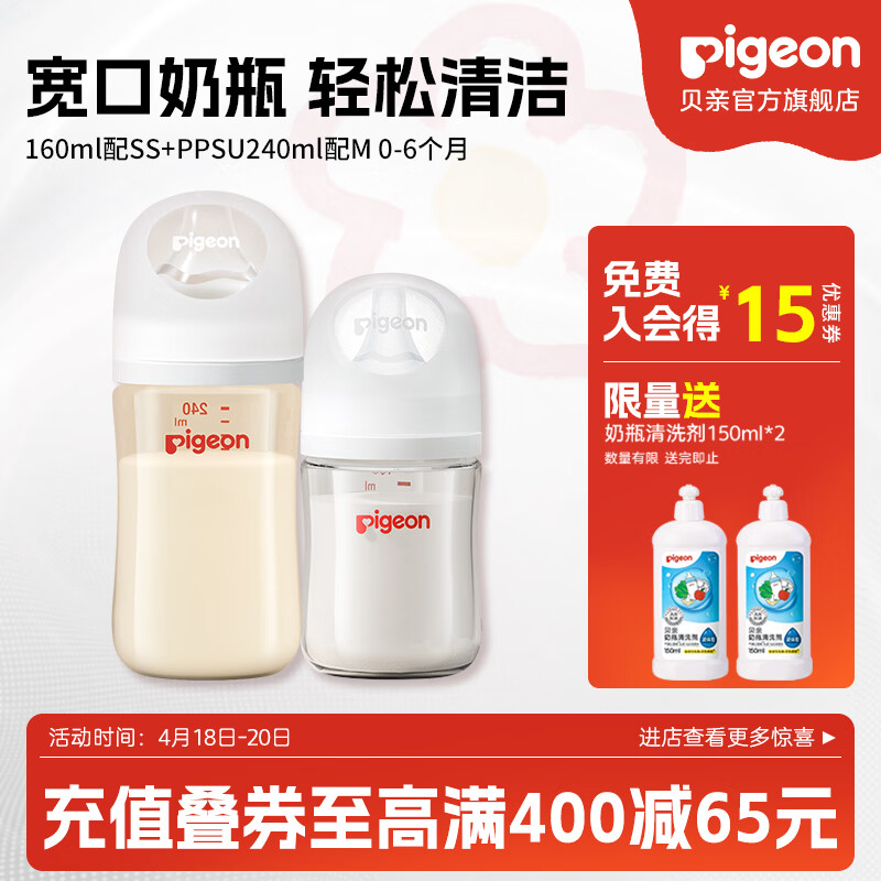 贝亲奶瓶 婴儿奶瓶 新生儿防胀气奶瓶 玻璃宽口径仿母乳亲喂感 160ml +(非玻璃)240ml 0-6个月