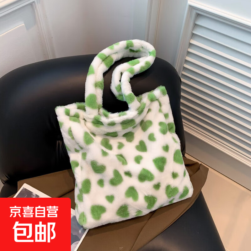 时尚大容量设计柔软舒适毛绒爱心托特包日常出行购物 小爱心绿 36*36*2cm
