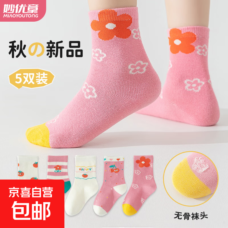 妙优童儿童棉袜舒适简约无骨男孩女孩百搭运动袜 樱桃大花 无骨五双装 4-6岁 M码 建议脚长13-16CM