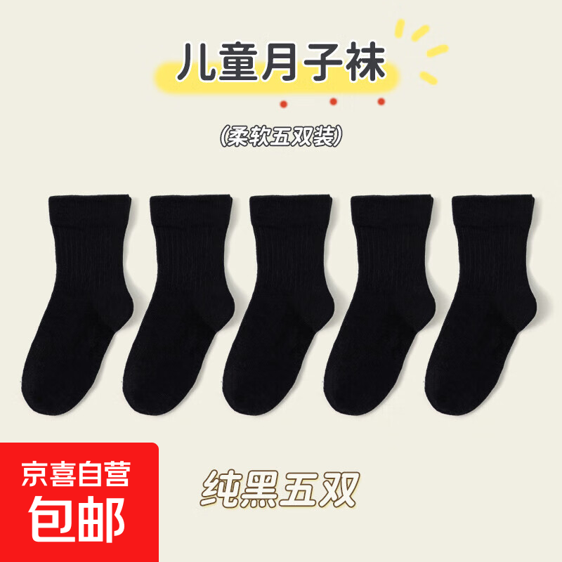 妙优童儿童棉袜舒适简约无骨男孩女孩百搭运动袜 纯黑 无骨五双装 9-12岁 XL码 建议脚长20-23CM
