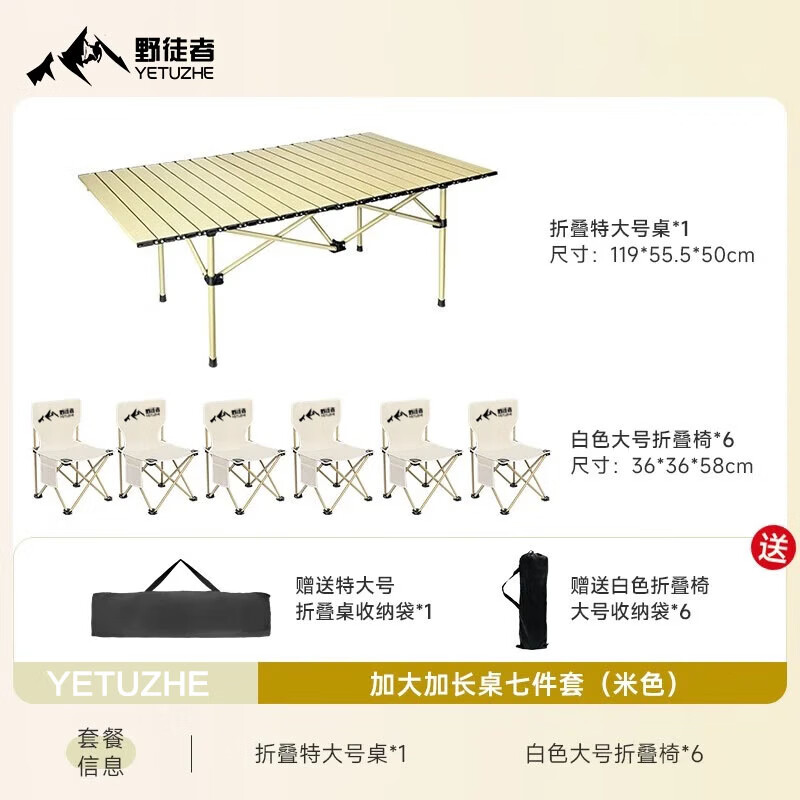 野徒者露营桌椅全套户外桌椅折叠椅野餐一桌四椅户外露营装备野炊蛋卷桌 120cm7件套【米色长桌+6把椅子】 新款升级