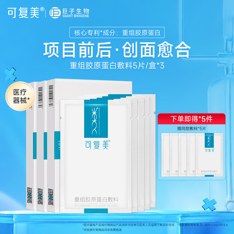 可复美重组胶原蛋白敷料椭圆型 激光子术后创面愈合 敏感肌肤皮炎症痤疮 椭圆敷料5片*3盒【赠同款5片】