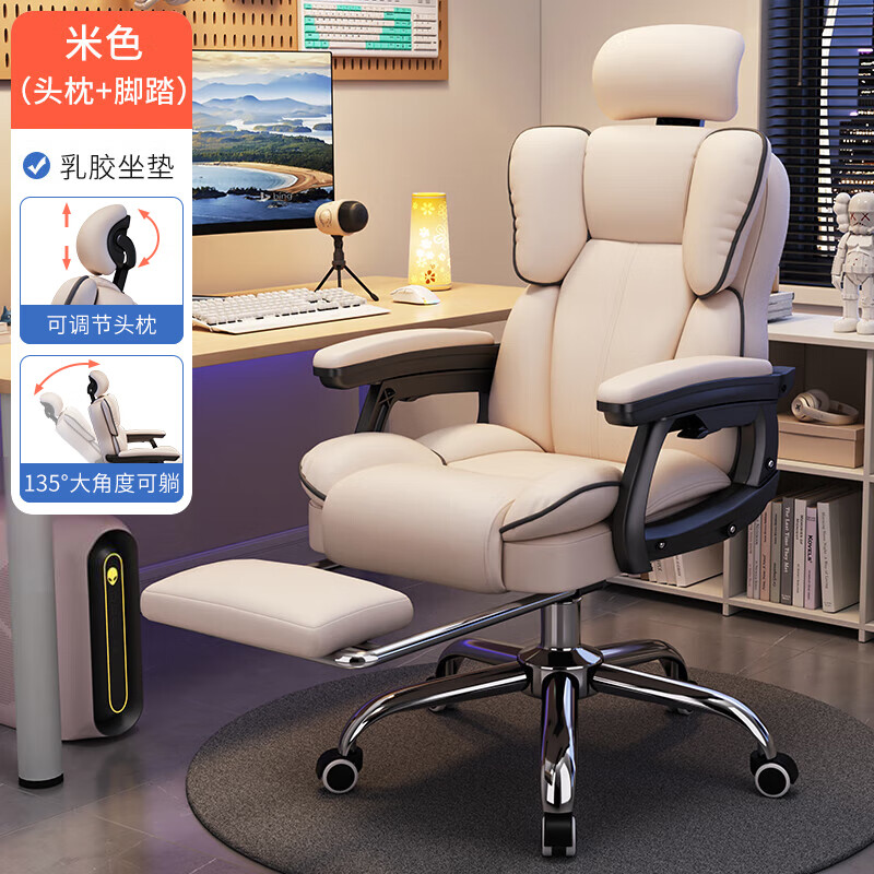 科幻猩电竞椅电脑游戏椅舒服久坐家用椅子办公椅可躺可升降椅座椅躺椅 超纤皮-米白+头枕+脚踏+乳胶坐垫-钢制脚 滑轨扶手