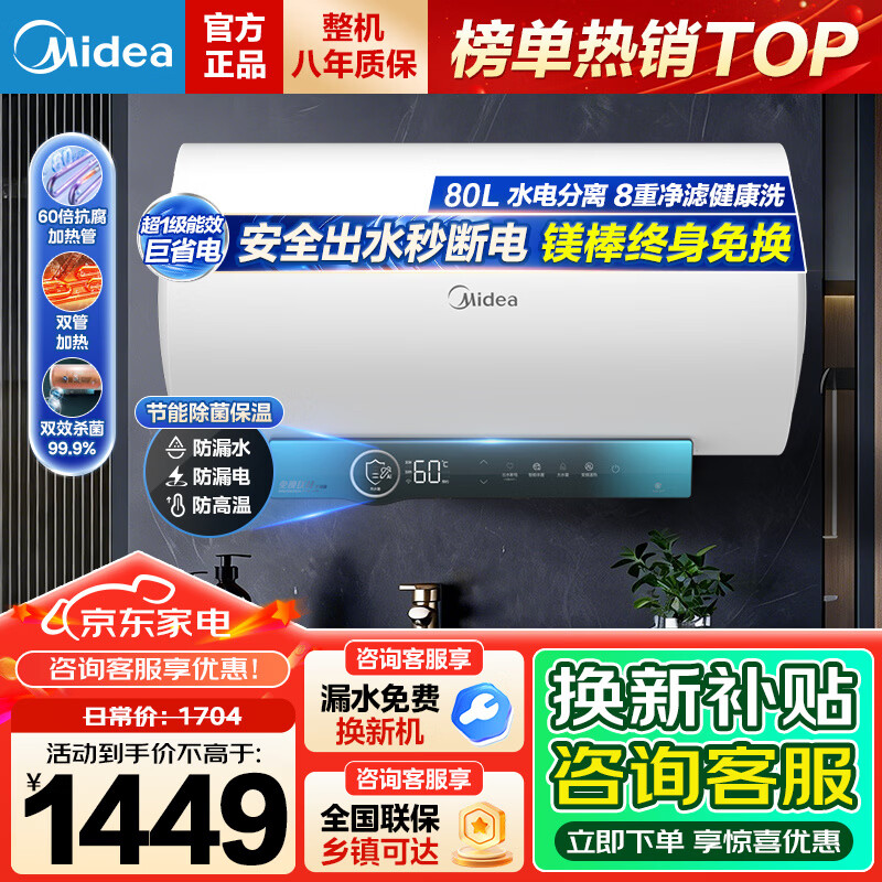 美的(Midea)电热水器【出水断电 JA5】60升一级能效家用洗澡热水器速热变频节能免换镁棒安全防电墙上门安装 80L 3300W JA5 出水断电·镁棒免换