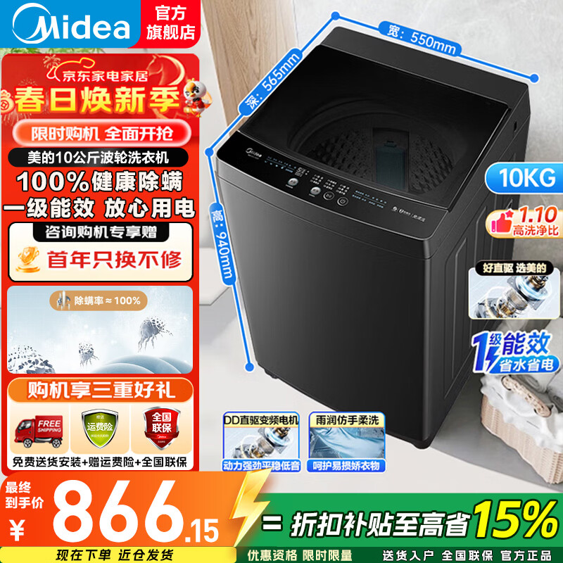 美的(Midea)波轮洗衣机 家用 租房 全自动 大容量 除螨洗 专利免清洗 快净科技 变频/定频 以旧换新 波轮 10kg 变频 升级款出租房必备 V36DT