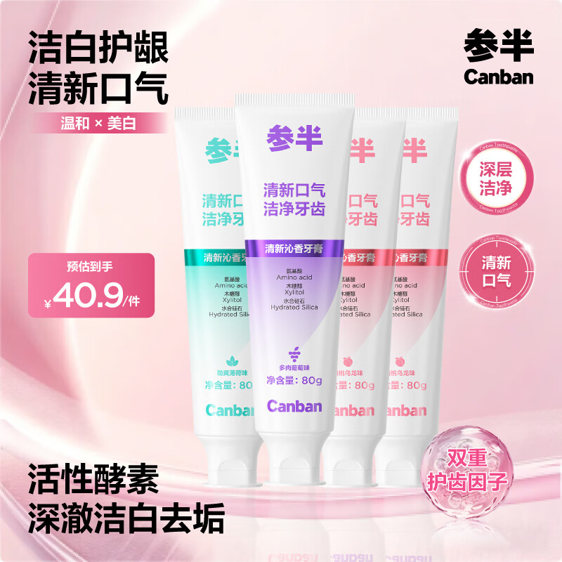参半清新沁香牙膏酵素洁白去渍清新口气温和清洁 白桃*2+薄荷+葡萄 80g*4支