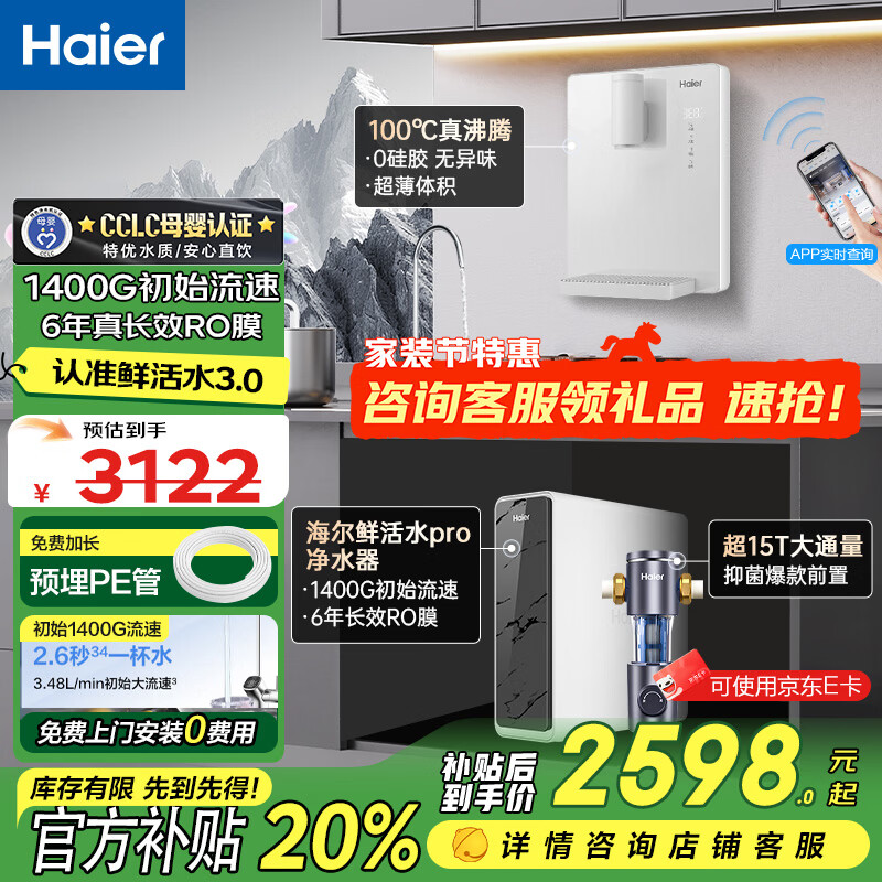 海尔(Haier)鲜活水Pro净水器管线机纯水家用瞬时1400G厨下式6年RO反渗透直饮机一体即热餐边柜R793套装1200G 净水器+真沸腾管线机+前置