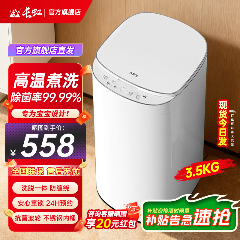 长虹【杀菌率99.9%】婴儿洗衣机洗烘一体小型迷你儿童宝宝专用全自动波轮洗衣机洗脱一体高温煮洗 3.5KG【高温煮洗+除菌99% 】深层洁净 波轮