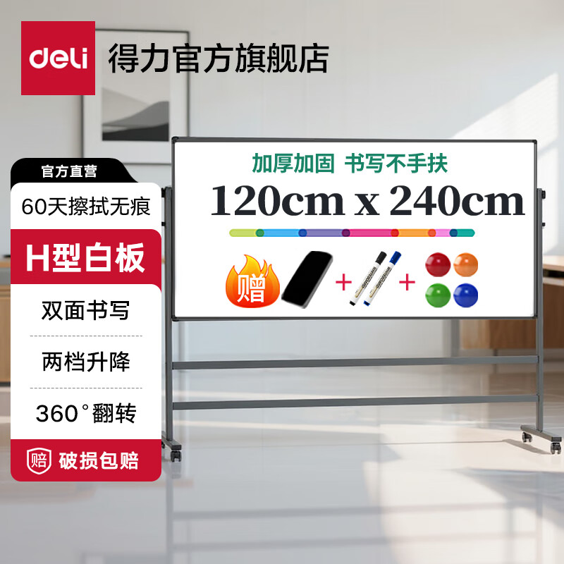 得力(deli)H型支架式白板 可上下升降可移动可磁性吸附办公会议白板 家用儿童教学画板写字板 【超大板面】240*120cm 双面书写 2档升降