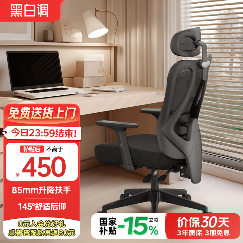 黑白调P1人体工学椅电脑椅办公椅子人工力学座椅久坐学习椅4向腰托 P1-高配【升降扶手】