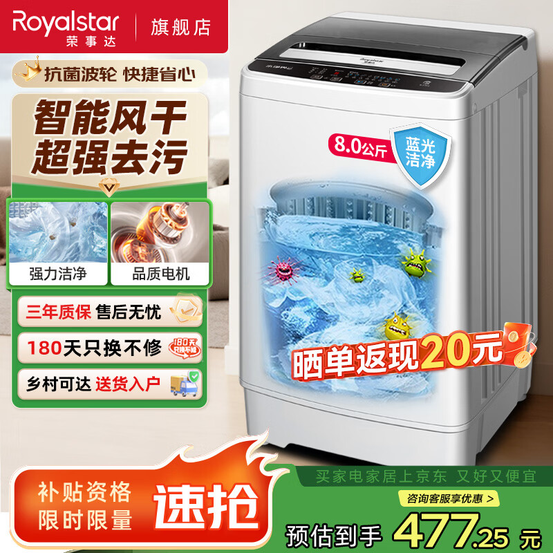 荣事达(Royalstar)8公斤全自动洗衣机大容量波轮家用租房节能省电一键脱水 8.0KG蓝光爆款【智能风干 节能省水】 波轮