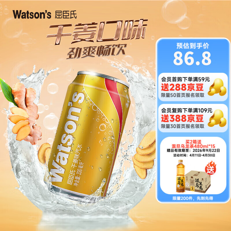 屈臣氏(Watsons)苏打汽水 气泡水 特调饮料 330ml*24罐 整箱装 聚会饮品 0脂 干姜口味(干姜水)
