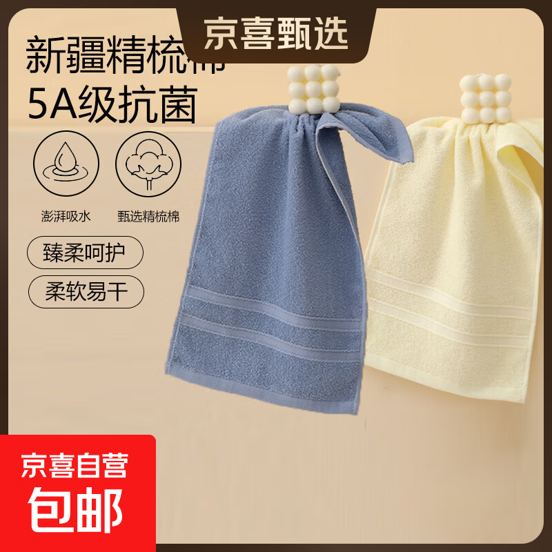 【洁丽雅同款】5A抗菌纯棉毛巾马卡龙色夏季运动毛巾情侣洗脸家用 5A抗菌素色面巾-蓝+黄 2条