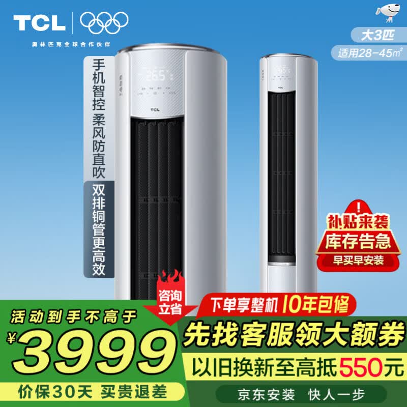 TCL空调柜机大3匹/2匹节能变频冷暖新能效母婴柔风 高温自清洁大风量除湿圆柱立柜式客厅空调柜机 大3匹 一级能效智能柔风真省电pro