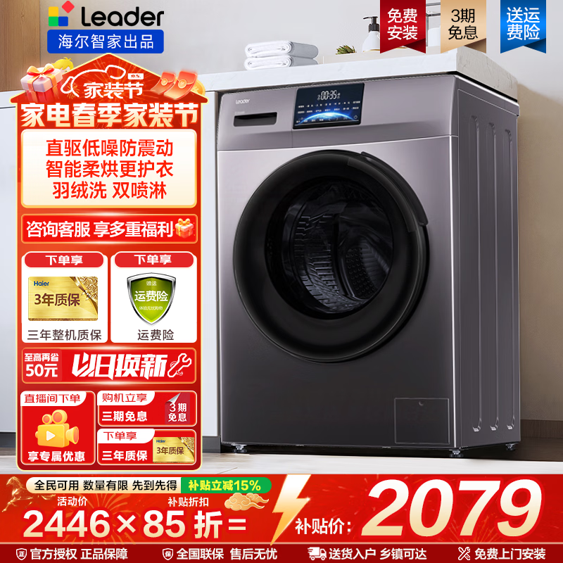 海尔(Haier)10kg全自动滚筒洗衣机大容量超薄洗衣机带烘干洗烘一体机一级能效节能除菌螨Leader 以旧换新补贴 【晶彩直驱】 滚筒洗烘 +蒸汽除菌+羽绒洗+空气洗