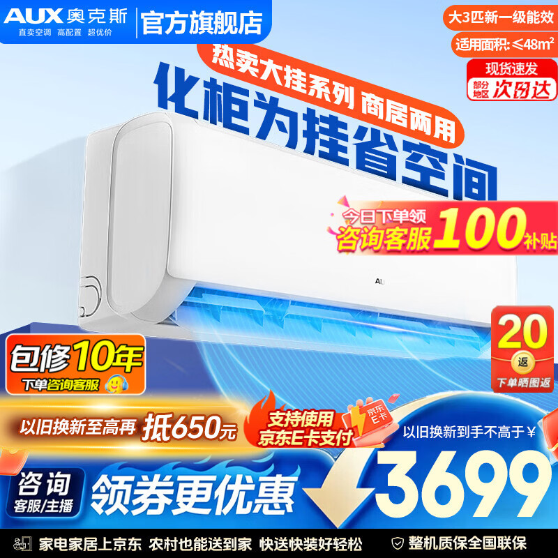 奥克斯(AUX)2匹省电侠Pro 1级空调挂机 大3匹空间劲省 快速冷暖 客厅挂式变频冷暖 澎湃大风量 以旧换新 大3匹 一级能效澎湃大风量