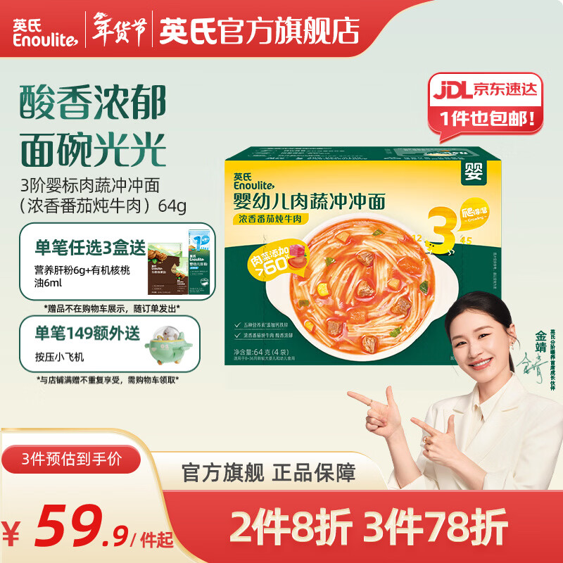 英氏(Engnice)【宝宝面条专区】婴幼儿有机面条辅食儿童意面碎碎面蝴蝶面 3阶肉蔬冲冲面(浓香番茄炖牛肉)64g