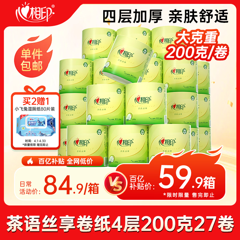 心相印有芯卷纸 茶语丝享4层200g*27卷 卫生纸巾 卷筒纸 厕纸 整箱销售