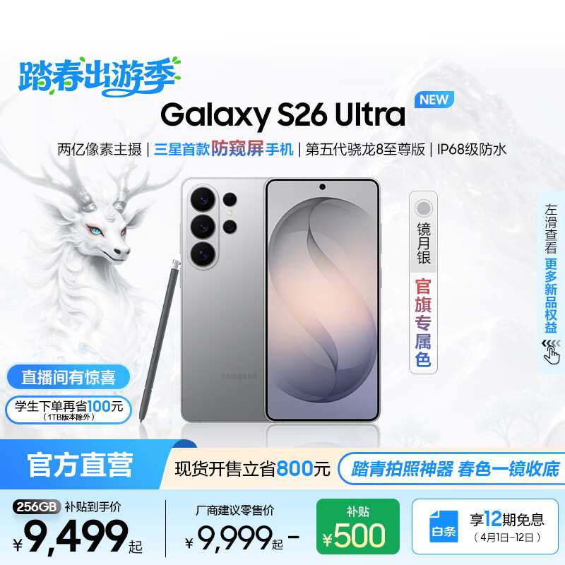 三星(SAMSUNG)Galaxy S26 Ultra 第五代骁龙8至尊版 2亿像素 AI优化自拍 防窥屏 游戏 防抖 手机 焕新补贴 【隽雅|镜月银】 12GB+512GB 官方标配