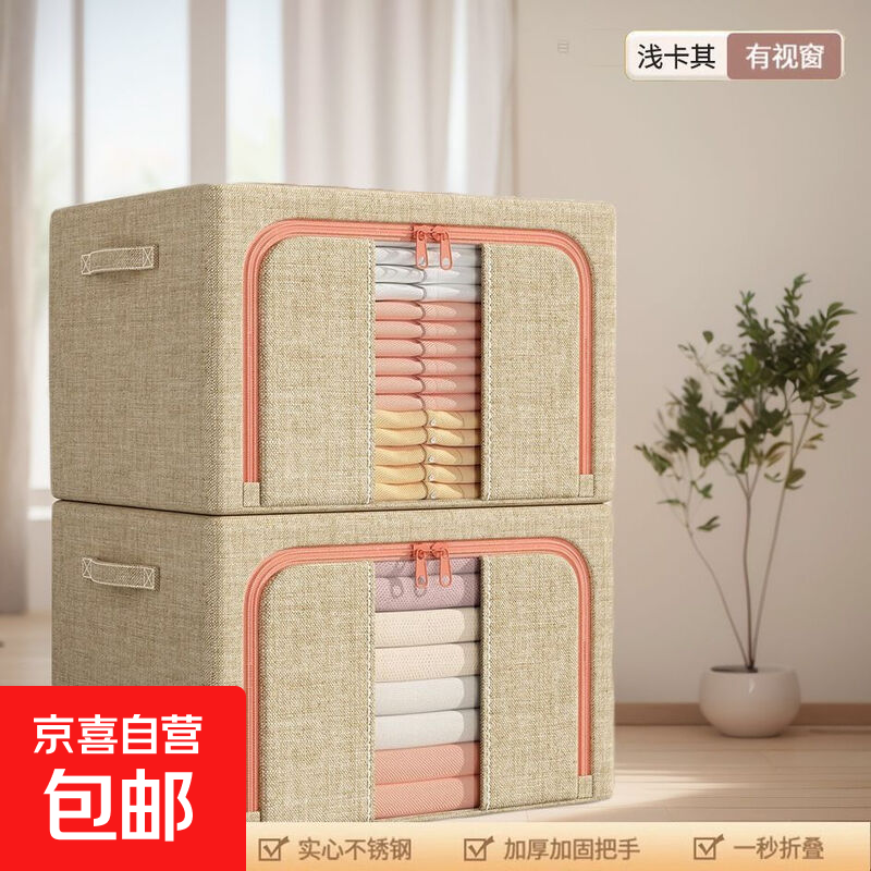 京东物流 棉麻衣服收纳箱家用大容量布艺折叠筐衣柜棉被储物神器 米色【透视窗】双开门 66升-防潮防霉【50*40*33CM】1个