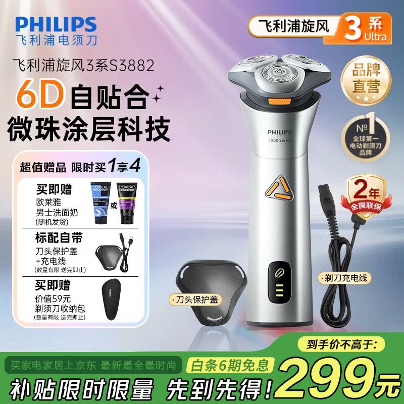 飞利浦(PHILIPS)剃须刀电动剃须刀飞利浦原装进口刮胡刀飞利浦电动剃须刀胡须刀剃胡刀官方旗舰店送男友生日礼物 【礼品套装】旋风3系 星耀银