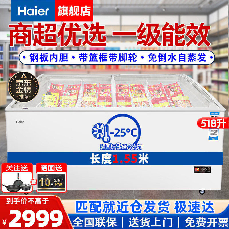 海尔(Haier)商用卧式大容量展示柜冰柜冷冻商超组合岛柜玻璃门雪糕柜弧形门海鲜冻品 1.55米零下25℃冷冻519升一级能耗电子温控带锁