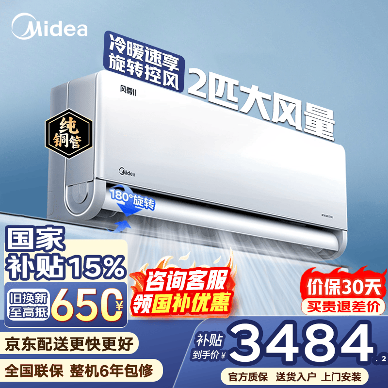 美的(Midea)空调挂机风尊二代Pro大1.5匹 新一级能效 变频节能冷暖两用壁挂式卧室空调防直吹APP智控 以旧换新 风尊二代 2匹 循环大风量 省电省空间