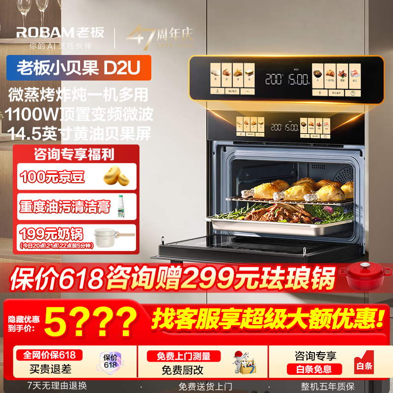 老板(Robam)【小贝果D2/D2U/D3P】微蒸烤炸炖蒸烤箱一体机家用嵌入式蒸箱烤箱微波炉幻彩屏58L/77L陶瓷内胆 【高端款】58L小贝果D2U