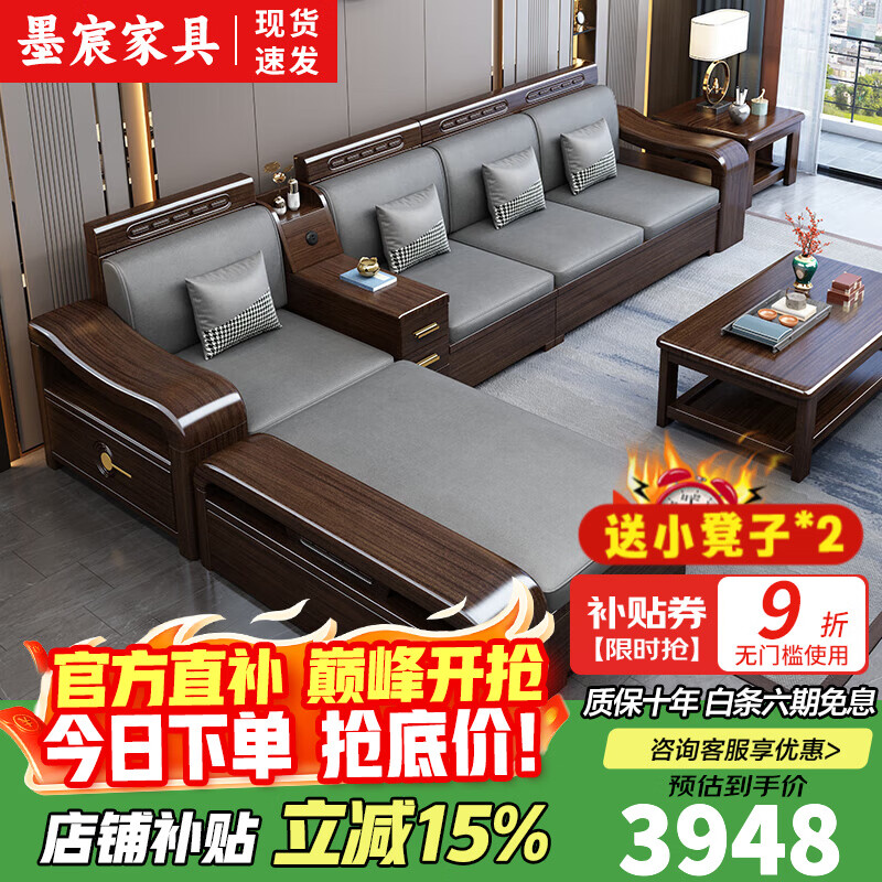 墨宸沙发 紫金檀木实木沙发新中式客厅大小户型冬夏两用转角储物家具 四人位+贵妃+茶水柜+茶几+电视柜