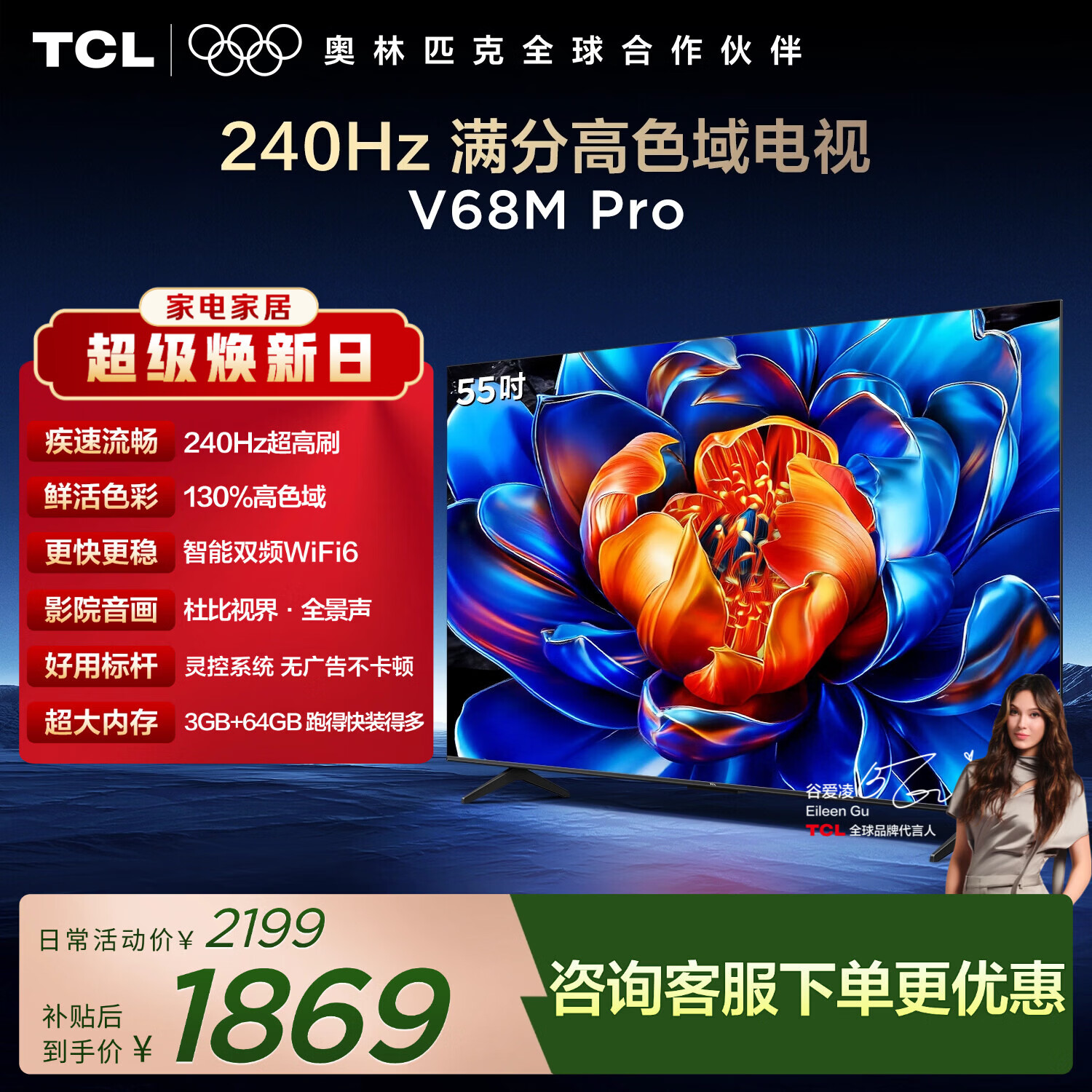 TCL电视 55V68M Pro 55英寸 240Hz高刷 高色域 WiFi 6 护眼电视
