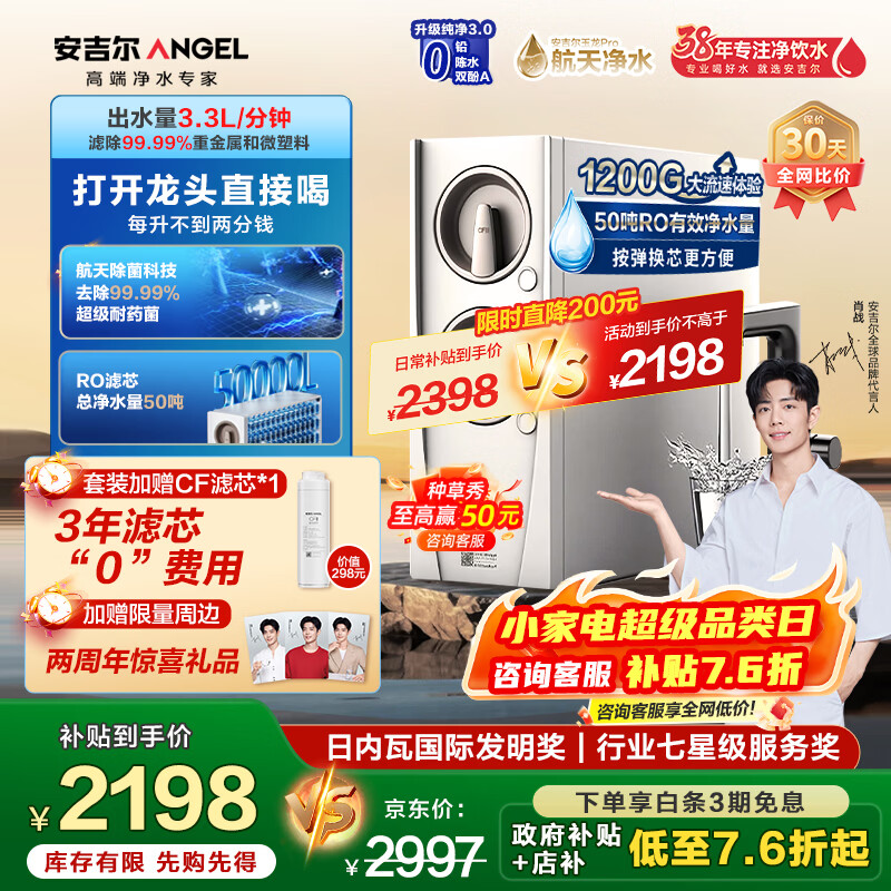 安吉尔净水器家用玉龙Pro1200G大通量3.3L/分钟反渗透5年长效RO膜反渗透厨下式纯水净饮机 【官方旗舰】玉龙Pro1200G
