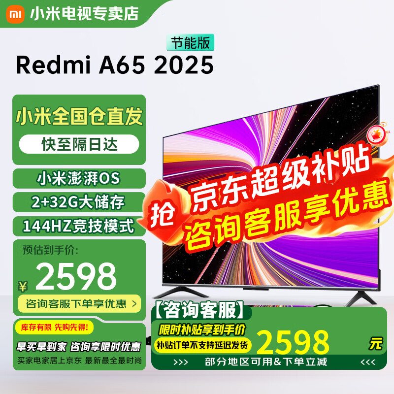 小米(MI)电视65英寸144Hz高刷2025款节能款4K远场语音金属全面屏智能家用液晶平板电视机家电补贴 65英寸 Redmi 65英寸【2+32G大存储】