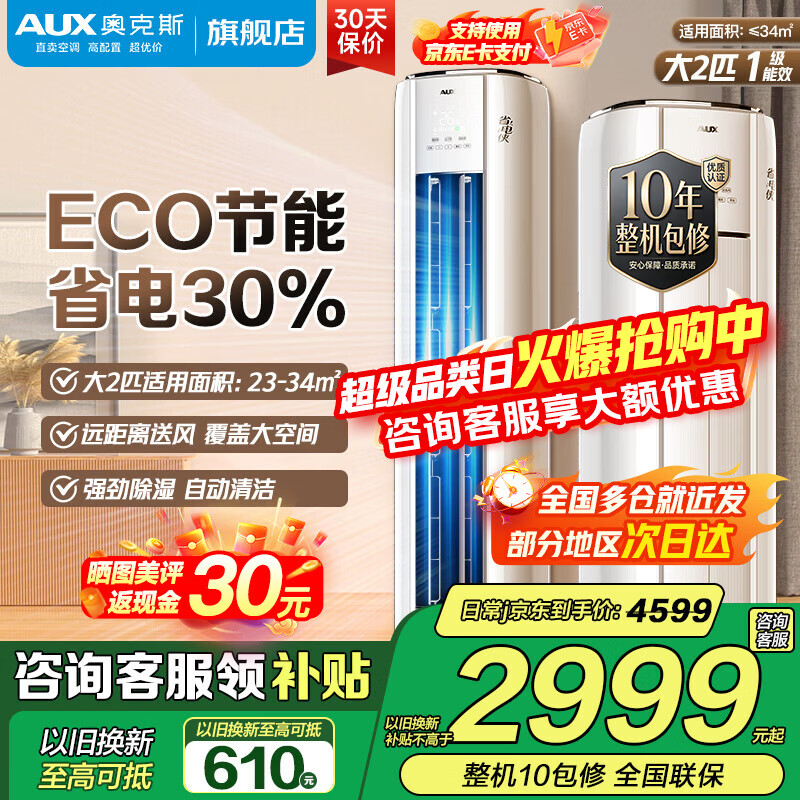 奥克斯(AUX)家电补贴15%大2匹/3匹新一级/三级能效变频冷暖节能省电家用立柜式圆柱空调柜机以旧换新 大2匹 一级能效 【变频冷暖大出风量】