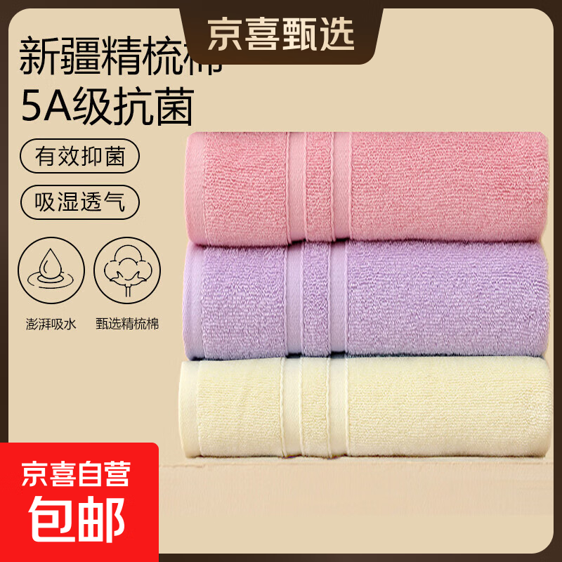 【洁丽雅同款】5A抗菌纯棉毛巾马卡龙色夏季运动毛巾情侣洗脸家用 5A抗菌面巾-粉+紫+黄 3条