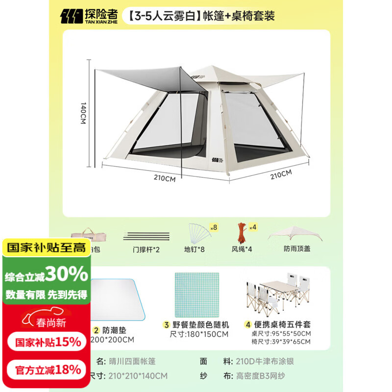 探险者(TAN XIAN ZHE)帐篷户外露营防雨过夜3人-4人速开便捷天幕二合一黑胶防晒帐篷 【5-8人云雾白】帐篷+桌椅套装