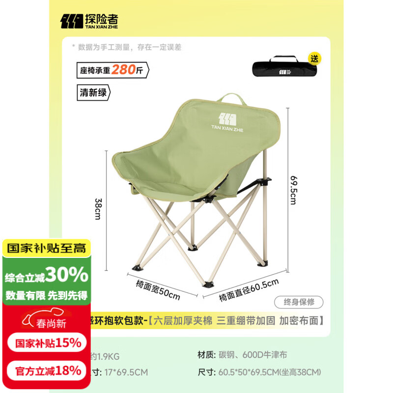 探险者(TAN XIAN ZHE)户外折叠椅露营椅子月亮椅便携折叠桌椅高靠背躺椅小凳子钓鱼椅 清新云感软包款清新绿【特级面料】