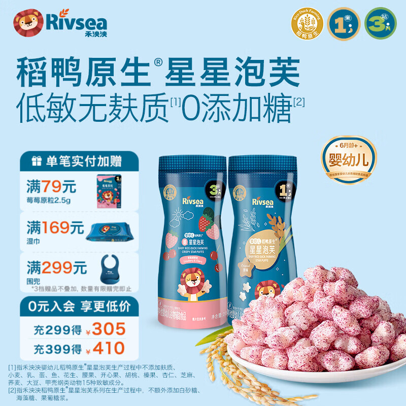 禾泱泱婴幼儿稻鸭原生星星泡芙 宝宝儿童零食低敏6个月以上辅食泡芙条 【2罐】星星泡芙原味16g+草莓味20g