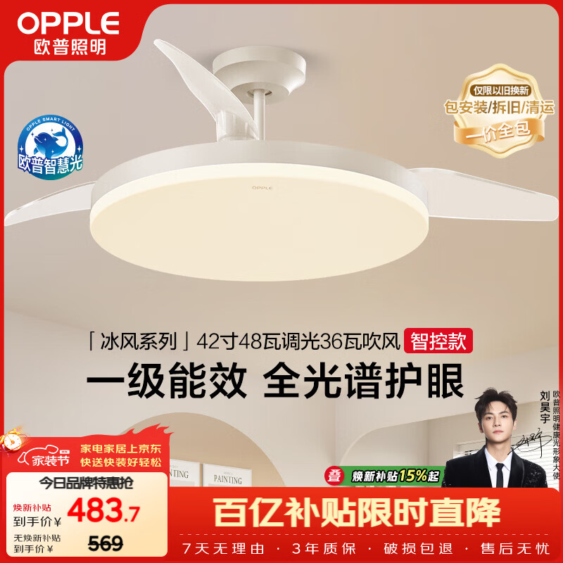 欧普照明(OPPLE)风扇灯42寸全光谱1级能效智能控制80瓦 餐厅卧室吊灯 冰风 包安装