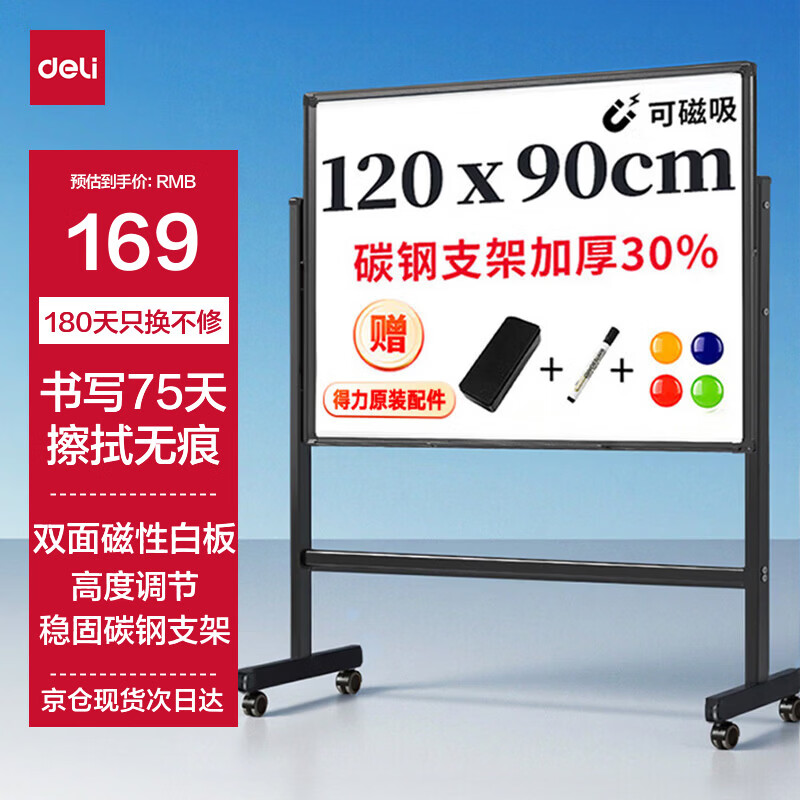 得力120*90cm支架白板 白板写字板书写稳固移动升降教学辅导办公会议磁性黑板家庭33725【销冠系列】