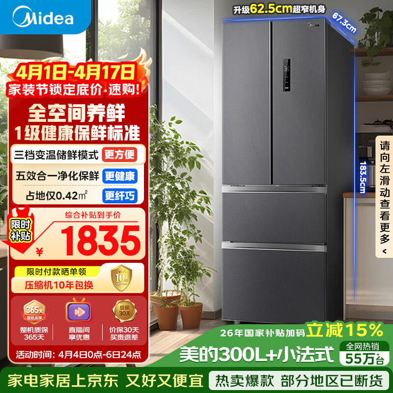 美的(Midea)325L法式四开门冰箱小户型超薄风冷无霜一级能效变频节能净味以旧换新BCD-325WFPM(E)国家补贴