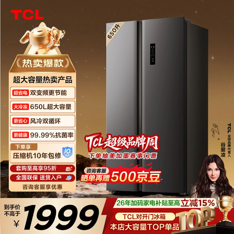 TCL 650L对开门冰箱超大容量大冷冻家用电冰箱双变频一级能效节能风冷无霜深冷速冻R650T3-S国家补贴