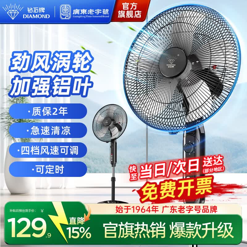 钻石牌(DIAMOND)电风扇落地扇家用风扇立式大风力客厅宿舍五叶扇轻音节能劲风远距电扇可定时SN 14寸机械四档【铝叶劲风】