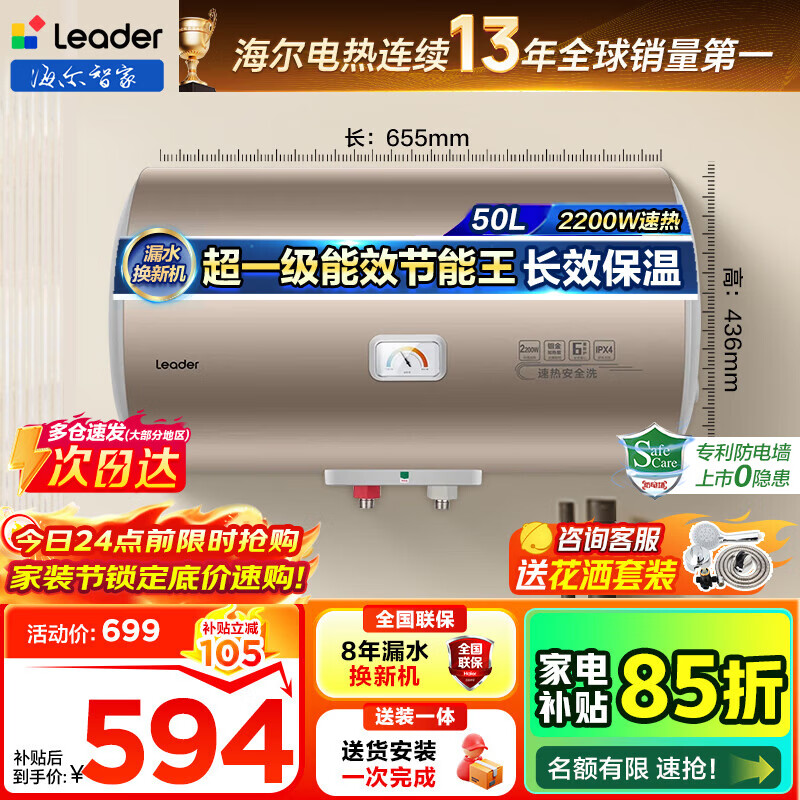 海尔(Haier)【咨询客服领补贴】统帅热水器电热水器家用储水式变频速热一级能效节能省电金刚无缝胆 50L 2200W 机械款/超一级能效/金色款