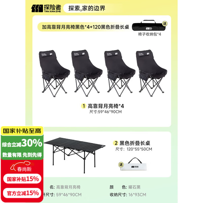 探险者月亮椅户外折叠椅露营椅子高靠背便携高背钓鱼野餐沙滩桌椅全装备 【耐脏性价比】加高靠背黑色*4+120款黑色折叠桌