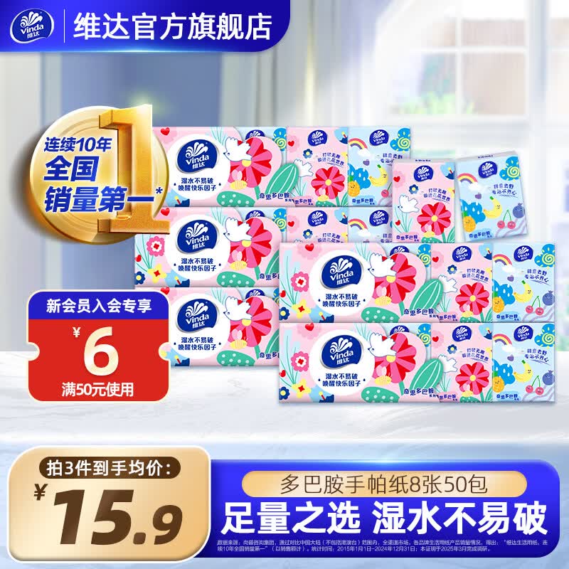 维达(Vinda)多巴胺手帕纸 自然无香 纸手帕餐巾纸卫生纸小包纸巾 湿水不易破 【大容量】 3层 8张*50包
