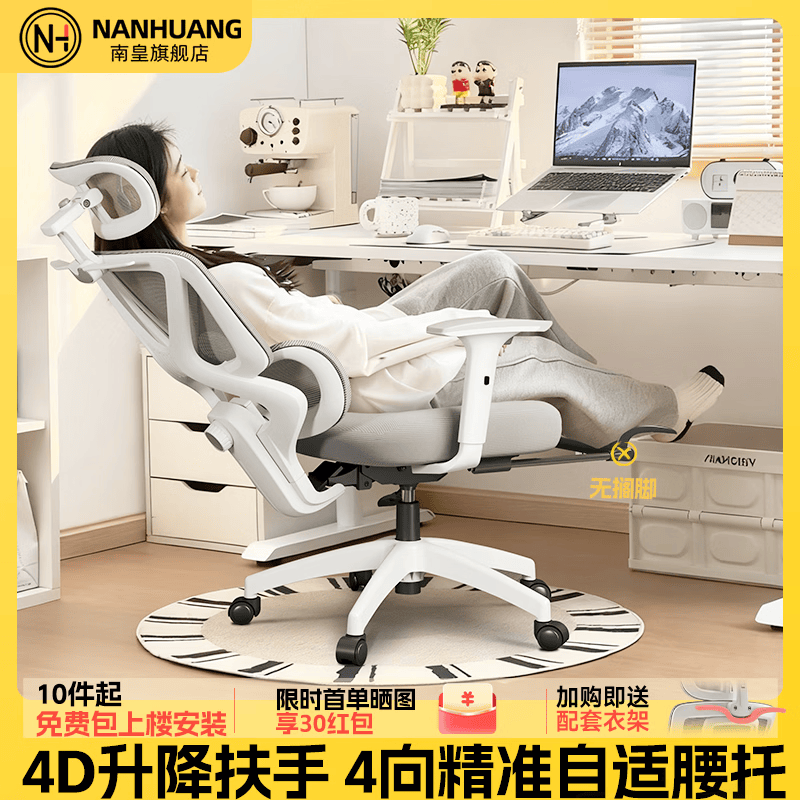 南皇人体工学椅护腰电脑椅久坐不累办公椅电竞椅男可调节腰靠书房可躺 Pro四向乳胶白-尼龙脚 155-180度(含) 可旋转可升降扶手