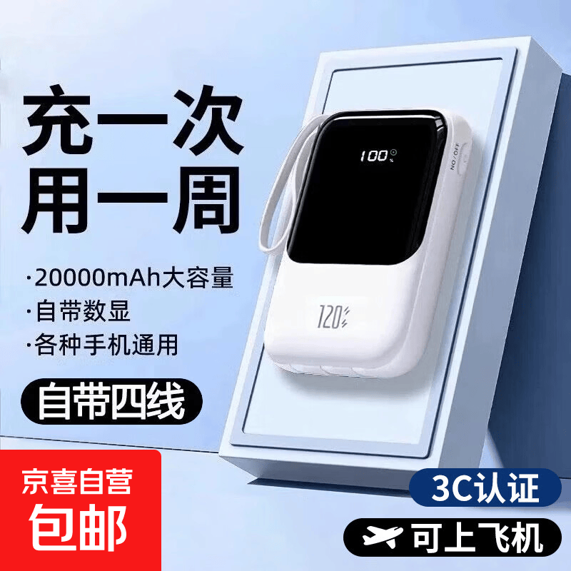 【新国标3C认证】20000毫安充电宝大容量自带线移动电源适用苹果华为小米通用超级快充数显电量 云朵白【20000毫安】 【旗舰版】国标3C认证+自带数显+提速300%