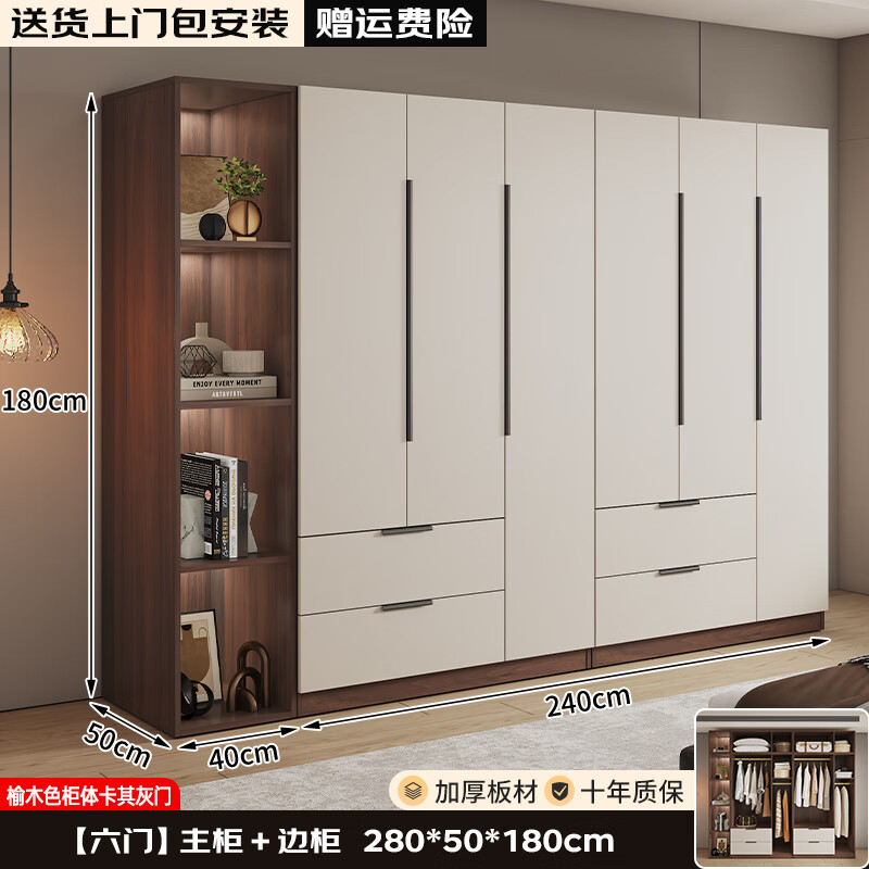 陌隆福衣柜卧室家用出租房用组装简易储物柜小户型简约现代衣橱 【六门】2.4米主柜+边柜